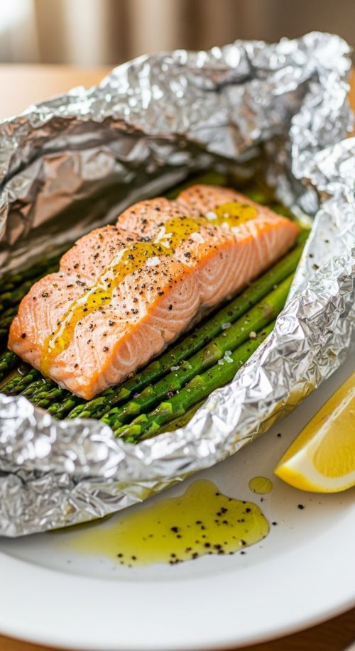 Salmon and Asparagus Foil Packets: Place salmon fillets on foil, surround with asparagus, drizzle with olive oil, and bake.