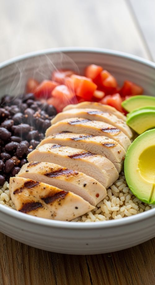 This bowl is built for fullness and simplicity. Grilled chicken provides dense protein while beans add fiber that slows digestion. Together, they keep hunger quiet for hours. Cook chicken in bulk with salt, garlic, and paprika. Slice and store for quick assembly.
