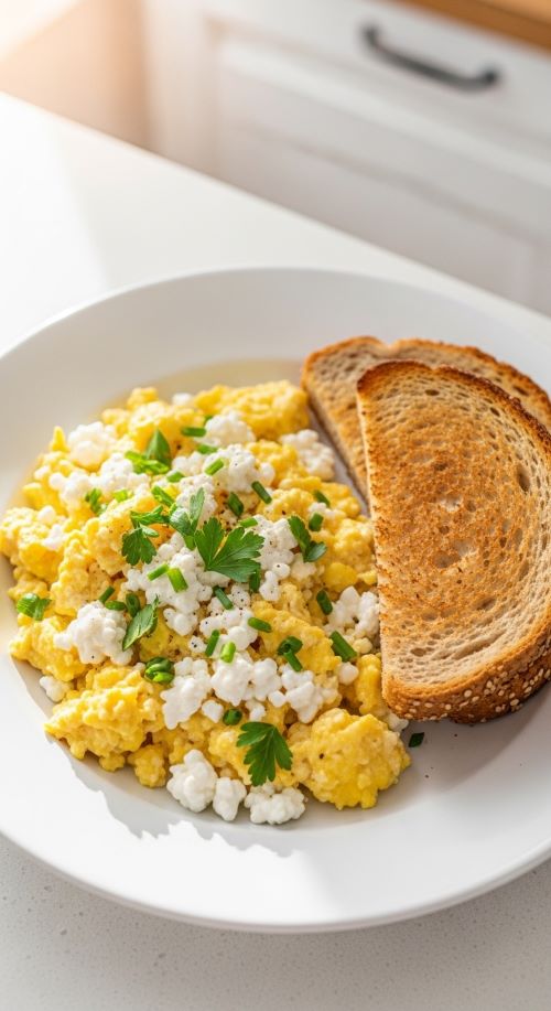Eggs cook fast and deliver reliable protein. Mixing cottage cheese into scrambled eggs adds creaminess and extra staying power. The texture becomes soft and rich without needing butter or heavy sauces.