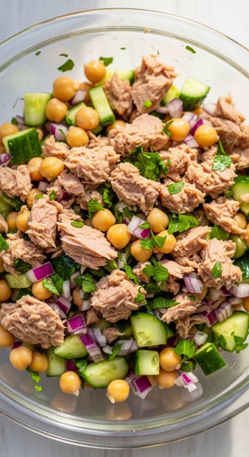 Canned tuna and chickpeas form a powerful protein pair that requires zero cooking. Drain both well and toss with chopped vegetables and lemon. The result is hearty and refreshing.