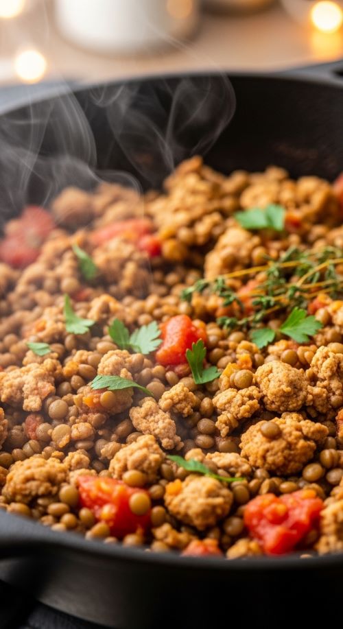 Ground turkey cooks fast and absorbs flavor easily. Lentils bring fiber and protein, creating a hearty skillet meal that reheats well.