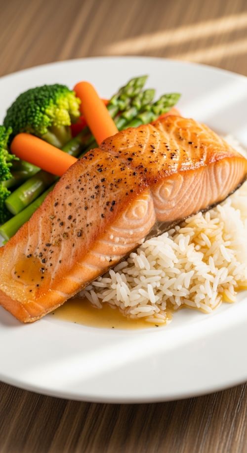 Salmon offers protein and healthy fats that slow digestion. Pairing with rice creates a balanced plate that feels substantial.
