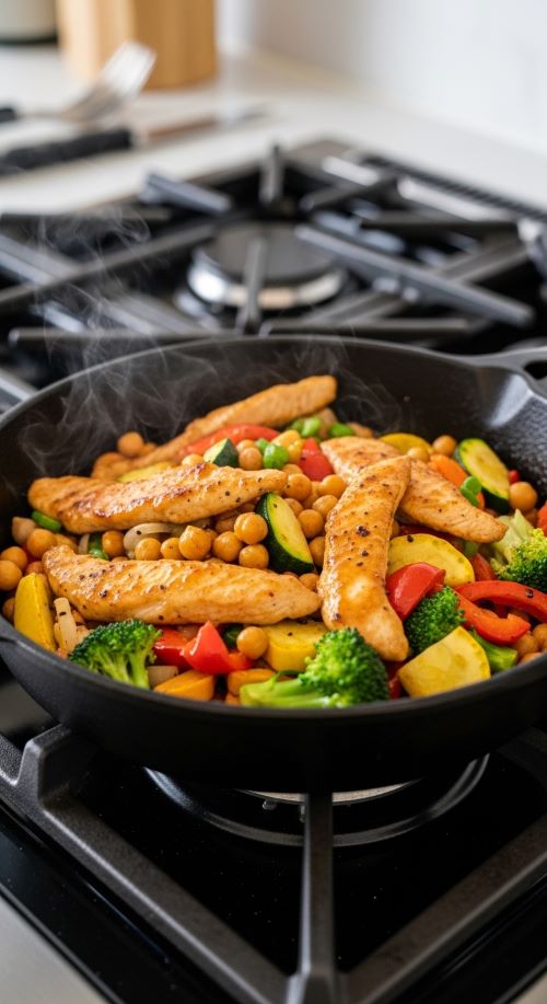 This stir fry merges pantry staples with lean protein. Cook chicken first, then add chickpeas and vegetables.