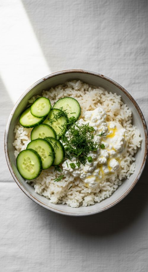 Cottage cheese adds protein and creaminess to simple rice bowls. Pair with crunchy vegetables for texture contrast.