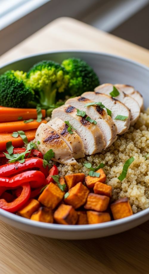 Quinoa adds protein and texture to chicken bowls. Roast vegetables while grains cook.