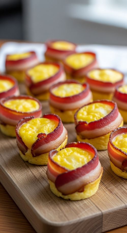 Bacon and egg muffins work like portable breakfasts. Line a muffin tray with bacon slices, crack eggs inside, and bake.