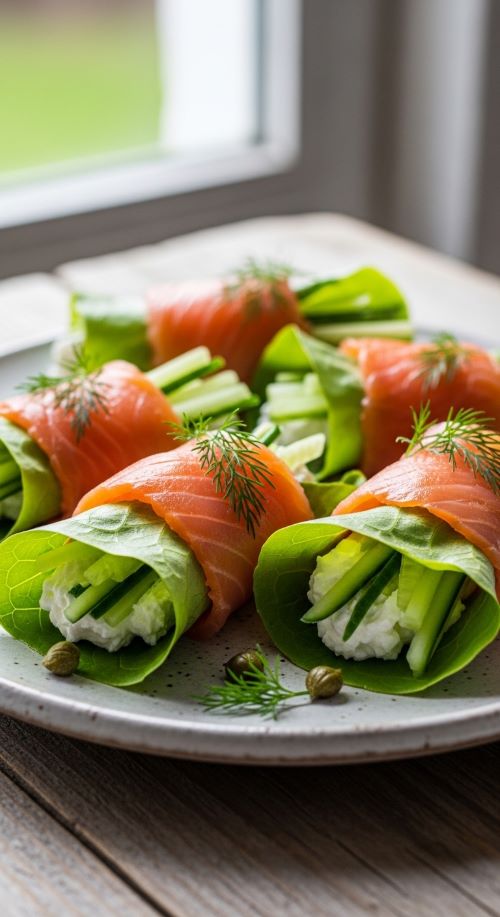 Smoked salmon lettuce wraps feel special yet require almost no cooking. Spread cream cheese on lettuce leaves and roll salmon inside.