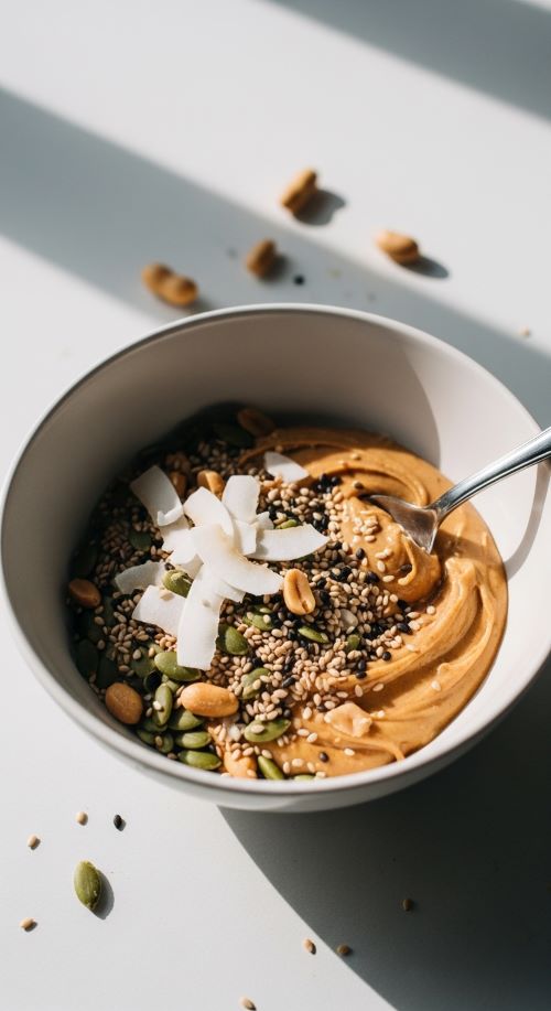 Mix peanut butter with chia seeds and unsweetened coconut flakes for a fast breakfast bowl.