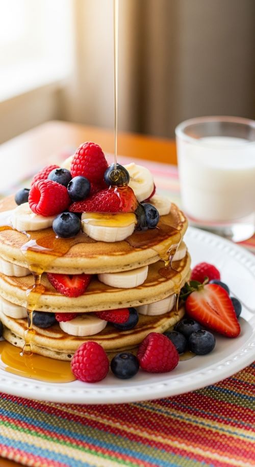 Pancakes aren’t just for mornings. Serve them for dinner with fruit and yogurt for a sweet twist. You can add grated carrots, zucchini, or pumpkin to the batter for a hidden veggie boost. Make small pancakes to keep portions manageable. This meal is inexpensive and fun, and kids can help mix the batter or place toppings. It’s a playful way to enjoy dinner together while sneaking in some nutrition. Serve with a side of scrambled eggs for protein.