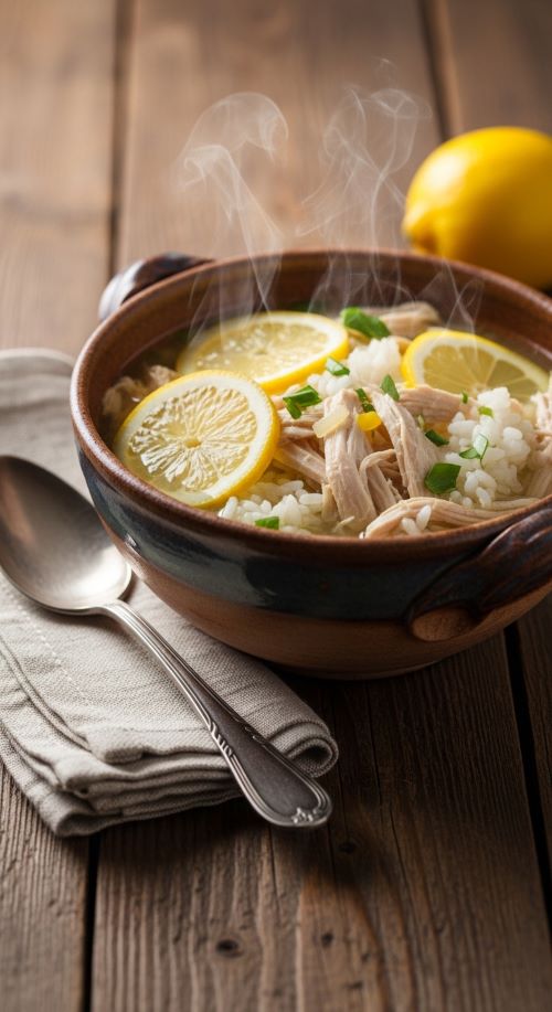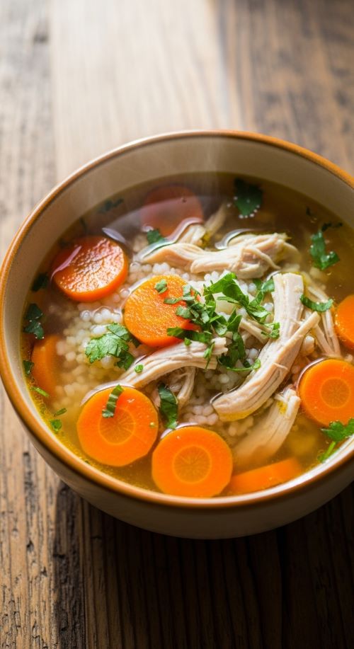 Rice and chicken soup offers simple comfort. Cook onion and carrots in a pot, then add broth, shredded chicken, and uncooked rice.