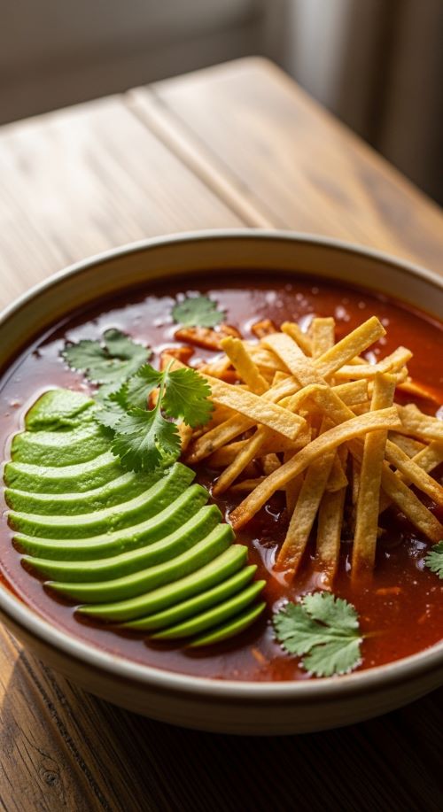 Serve with crispy tortilla strips, avocado slices, and lime juice.