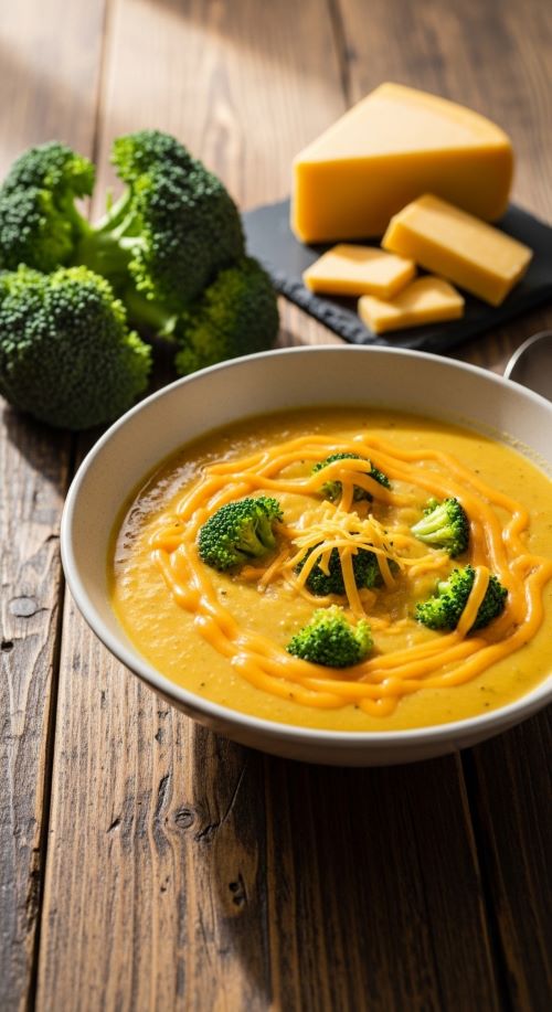 Broccoli cheddar soup is creamy and comforting. Cook onion and garlic, add broccoli and broth, and simmer until the broccoli softens.