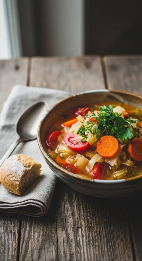 Cabbage soup is light yet filling. Cook onion and garlic, add chopped cabbage, carrots, tomatoes, and broth.