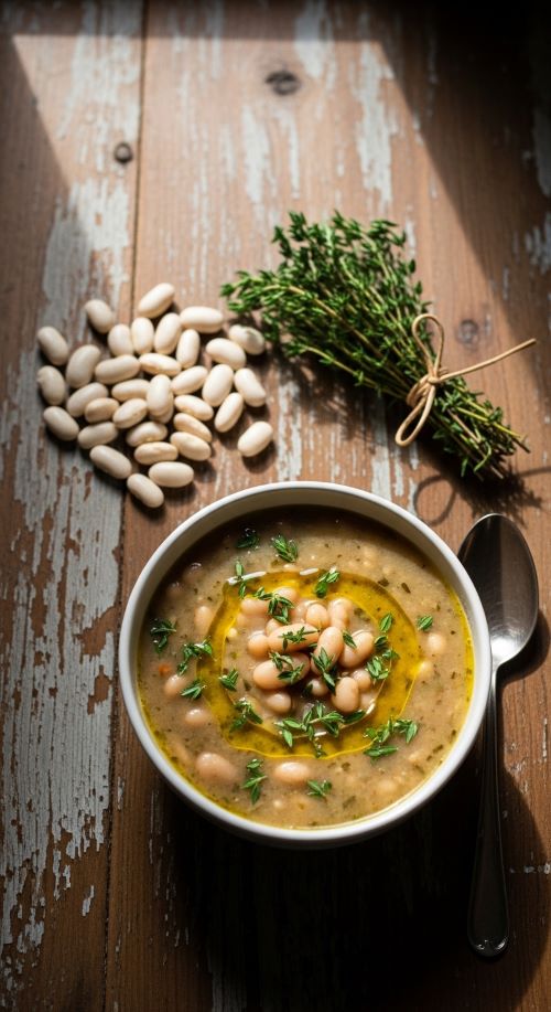 Cook onion and garlic in oil. Add canned white beans and broth.
