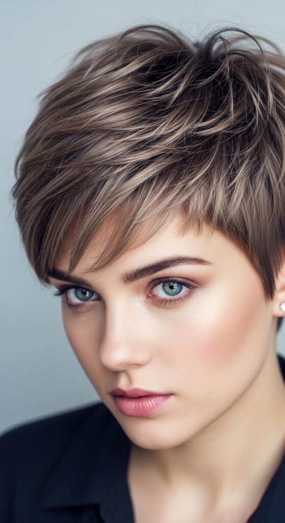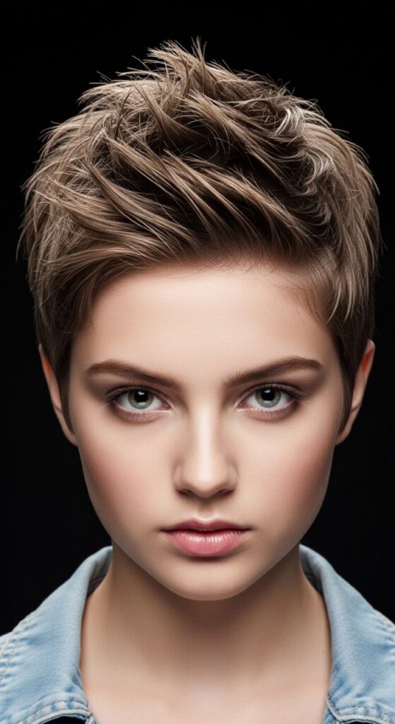 The spiky pixie style is playful and bold, giving your hair a sharp and energetic look. The hair is styled upward into small spikes, which adds texture and personality. To achieve this look, use a strong hold gel or wax. Take a small amount, rub it between your fingers, and shape the spikes quickly. You don’t need expensive products; even a basic styling gel works well. This style is easy to maintain because you can restyle it throughout the day with minimal effort. It’s a great option if you like a more expressive and edgy hairstyle that stands out without needing a lot of time.