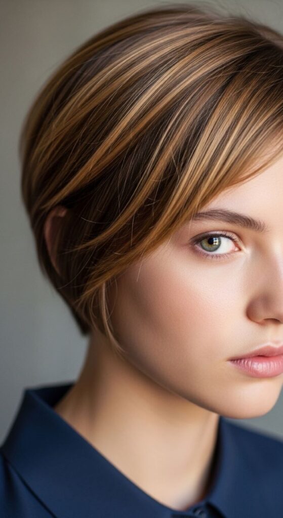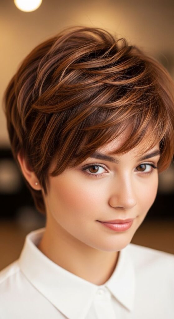 The soft feminine pixie is all about gentle layers and a natural finish. The hair is cut in a way that frames the face softly without sharp edges. To maintain this look, use a light styling cream to keep the hair smooth and manageable. This cut is easy to maintain and doesn’t require frequent styling. A simple trim every few weeks keeps it looking neat. It works well for everyday wear and pairs nicely with minimal makeup and casual outfits.