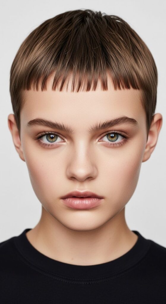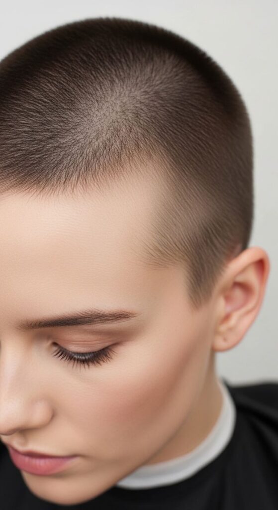 The ultra short buzz pixie is the simplest version of a pixie cut. The hair is cut very close to the scalp, making it extremely easy to manage. You can maintain it at home with a clipper, which saves money and time. This style requires almost no styling, making it ideal for a low-maintenance routine.