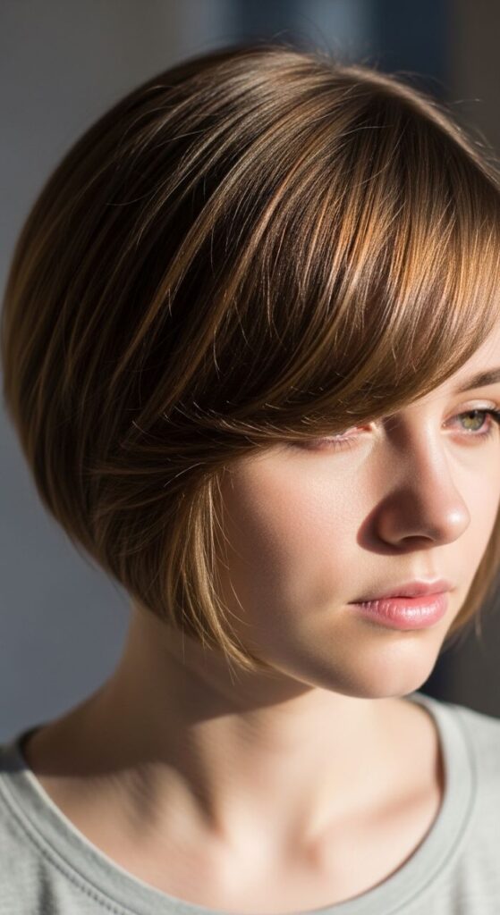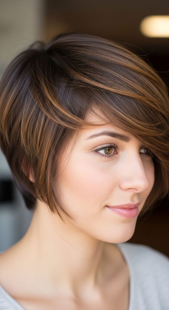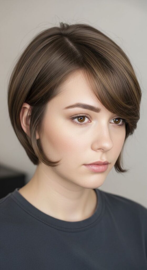 A pixie with long bangs offers a balance between short hair and soft framing around the face. The longer fringe falls across the forehead, adding a gentle and stylish touch to the overall look. This style is ideal if you are not ready to go fully short in the front. You can sweep the bangs to one side or let them fall naturally for a relaxed appearance. Styling is simple; just use a small round brush while blow-drying to guide the bangs into place. If you prefer a budget-friendly method, you can air dry and shape them with your fingers. Trimming the bangs at home is possible if you use sharp scissors and cut small sections at a time. This haircut works well with glasses and suits both casual and semi-formal looks. It gives you flexibility while still keeping your routine easy and manageable.