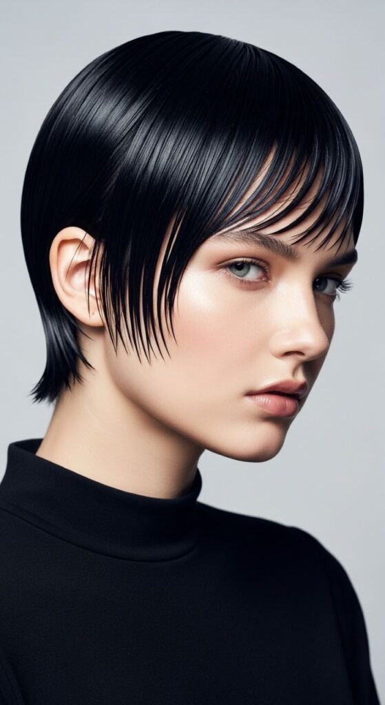The classic sleek pixie is all about simplicity and clean lines. The hair is cut close to the head with a smooth finish that looks neat and polished. This style works especially well if you prefer a tidy look that doesn’t require much effort every day. To maintain the sleek appearance, you only need a small amount of serum or lightweight oil. Apply it to damp hair and comb through for an even finish. If your hair has slight waves, a quick pass with a flat iron can help smooth it out. At home, you can keep the neckline clean using a small trimmer, which saves you from frequent salon visits. This haircut pairs well with both casual and formal outfits because of its simple shape. It also reduces styling time to just a few minutes, making it a practical choice for anyone who wants a polished look without extra work.