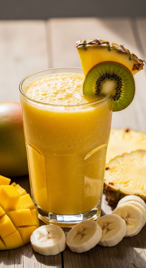This tropical smoothie combines pineapple, mango, and banana for a sweet and tangy flavor that feels like a mini-vacation in a glass. Simply blend equal parts pineapple and mango with one banana and a splash of orange juice. You can add a few ice cubes for a thicker texture. To save money, use frozen fruits—they last longer and give your smoothie a creamy consistency without extra sugar. For a richer flavor, a spoonful of Greek yogurt adds creaminess and a touch of protein. Garnish with a slice of kiwi or pineapple for a fun, Instagram-worthy touch. Perfect for breakfast or a sunny afternoon snack.