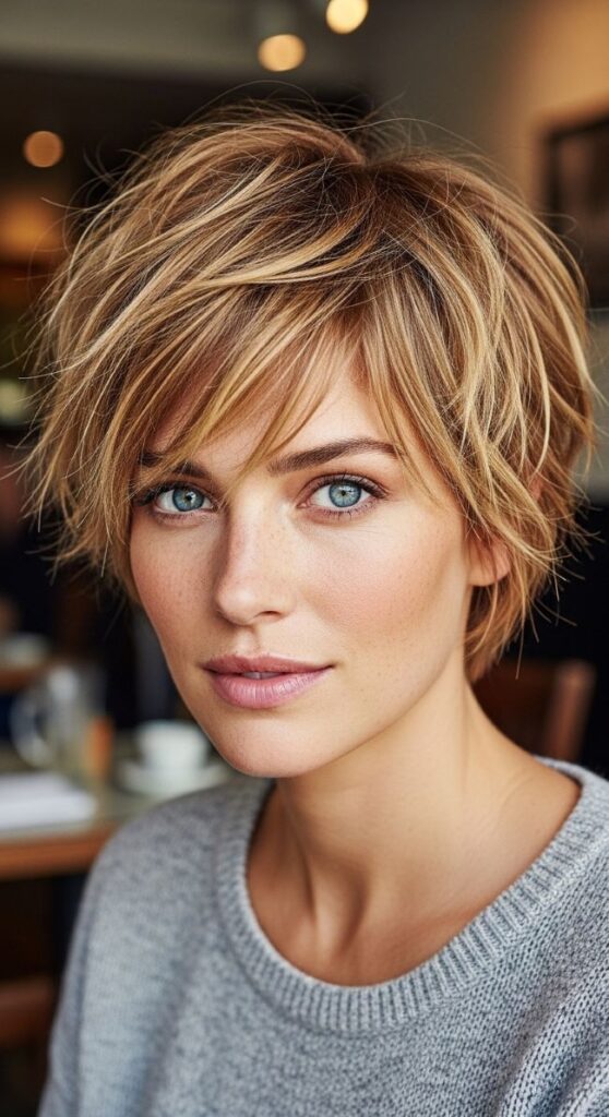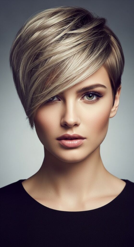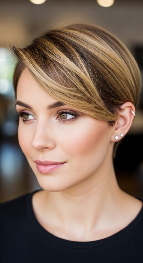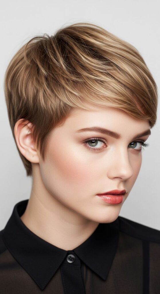 The side-swept pixie adds shape and softness with a simple change in direction. One side of the hair is left slightly longer, creating a gentle sweep across the forehead. This adds dimension without making the cut harder to manage. Styling is quick and easy. After washing, use your fingers or a comb to guide the hair to one side. A small amount of lightweight cream can help hold the shape. You can also switch the parting for a slightly different look. This gives you variety without needing a new haircut. At home, trim the shorter side regularly to keep the contrast clear. Leave the longer side untouched for balance. This cut works well for both casual and more polished settings. It frames the face nicely and softens sharp features. If you want a simple change that still feels stylish, the side-swept pixie is a smart option.