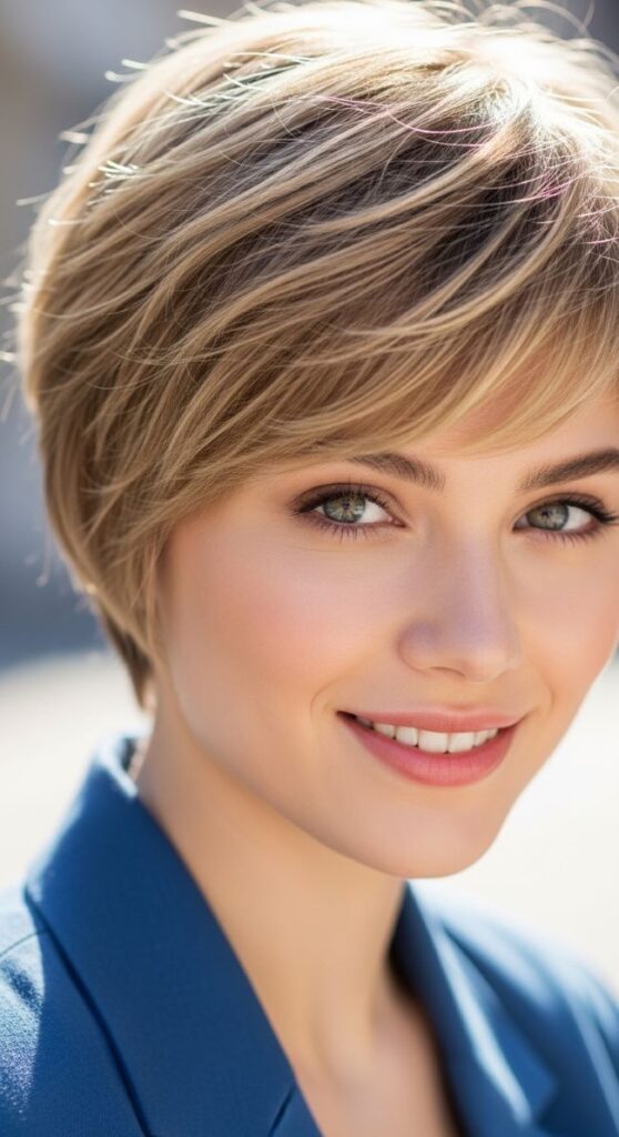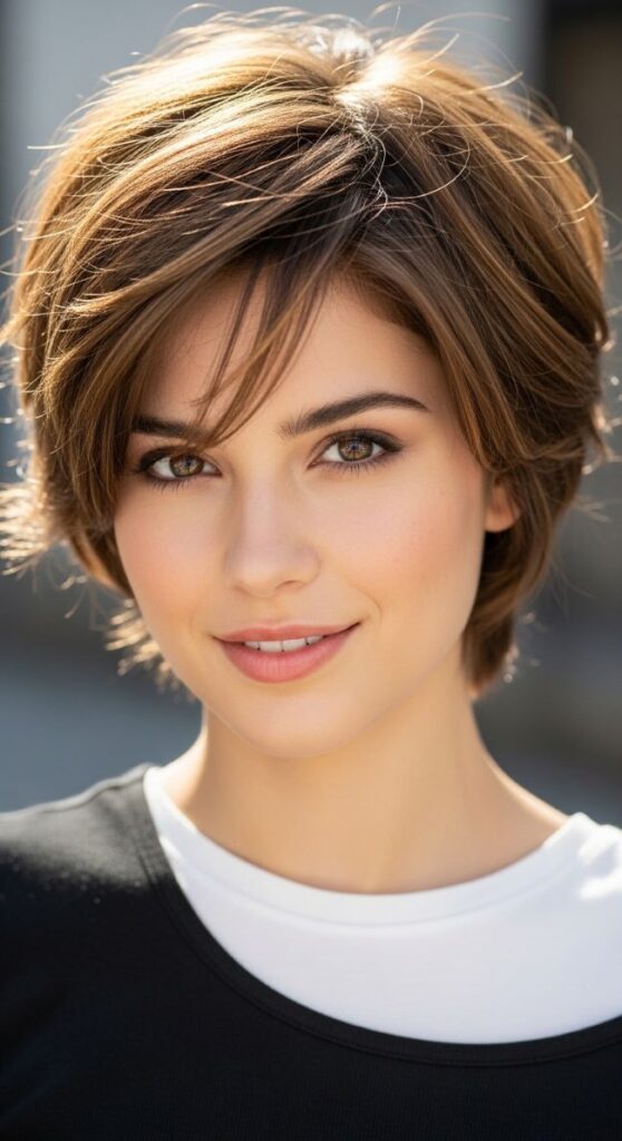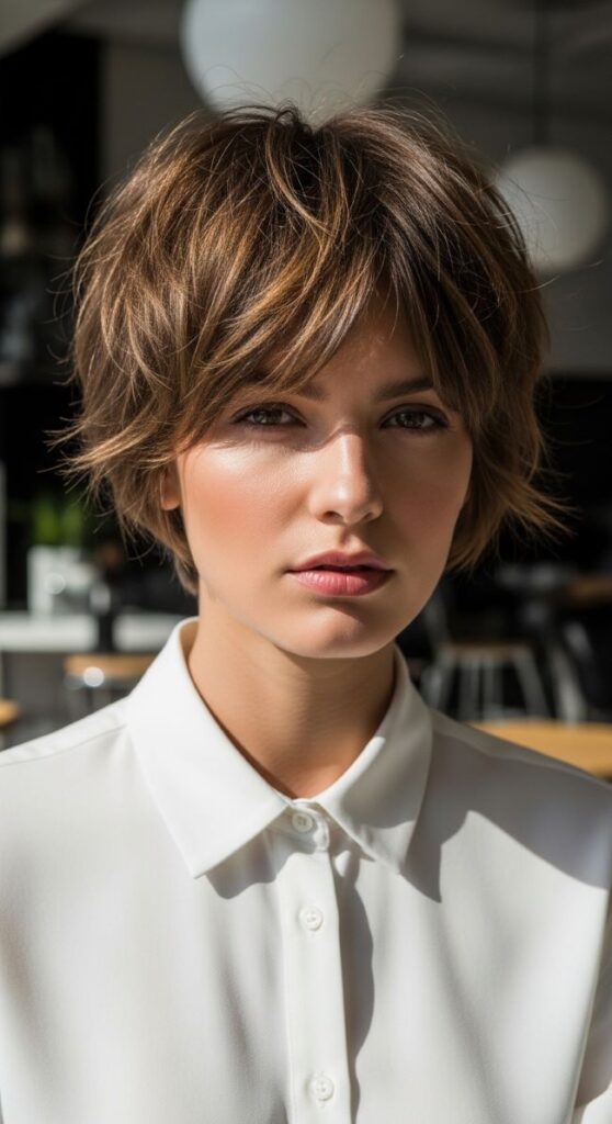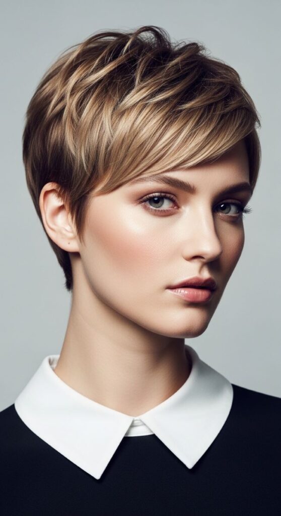 The feathered pixie uses light layers to create a soft, airy look. The ends are thinned slightly to reduce heaviness. This makes the hair move more naturally. You can style it using a comb or your fingers. A little water helps shape the layers without needing products. At home, thinning scissors are useful for maintaining the soft ends. Cut small amounts to avoid over-thinning. This style grows out nicely and stays manageable for weeks. It’s perfect if you like a gentle, natural appearance. The feathered pixie keeps things simple while still looking polished.