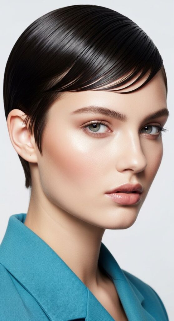 The slicked back pixie creates a clean and polished finish. It’s a great option for formal events or when you want a neat look. Apply a small amount of gel or cream and comb the hair backward. This smooths everything into place. The style takes only a few minutes. Maintenance is simple. Keep the length even with regular trims. You don’t need to style it every day. It also works well with slightly damp hair. This cut is easy to manage and looks sharp without much effort.