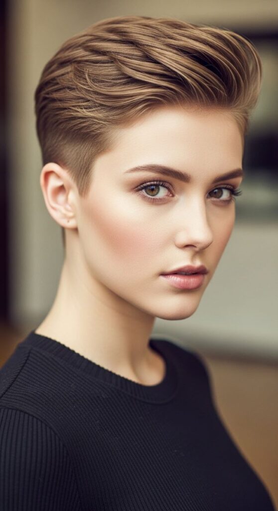 The undercut pixie creates a strong contrast between the sides and the top. The sides are shaved very short, while the top is left longer. This makes the top section stand out more. You can style it in different ways. Sweep it to one side, push it back, or leave it slightly messy. Maintenance is simple. Use clippers to keep the sides short every few weeks. The top can be trimmed less often. This style works especially well for thick hair because it removes bulk from the sides. It also feels lighter and cooler. You don’t need many products to style it. Finger styling is often enough. This cut is a great choice if you want something bold but still easy to handle at home. It gives a clear shape and keeps your routine simple.