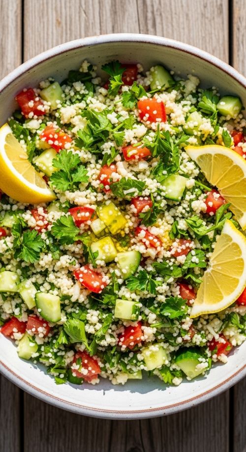 Cauliflower tabbouleh swaps bulgur for riced cauliflower. Mix with parsley, tomatoes, cucumber, and lemon juice. Affordable tip: buy parsley in bulk and freeze extras. This salad is refreshing, light, and pairs well with protein dishes, making it a great lunch or side.